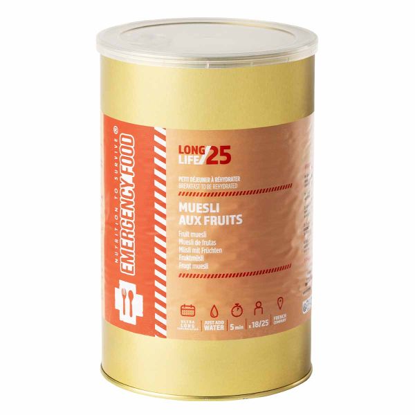 O muesli de frutas em lata de 1,8 kg foi especialmente concebido para situações de emergência e sobrevivência. Este pequeno-almoço completo e nutritivo é composto por cereais e frutas liofilizados, acondicionado numa grande lata de longa duração. Ideal para as suas reservas alimentares, garante disponibilidade a muito longo prazo graças à sua validade de 25 anos.