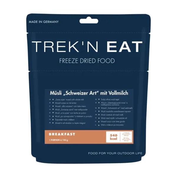 Com os seus ingredientes saudáveis e naturais, o muesli suíço com leite Trek'n Eat é também adequado para vegetarianos. O seu longo prazo de validade de 4 anos torna-o uma solução prática para guardar em casa para todas as suas aventuras ou mesmo como kit de emergência.